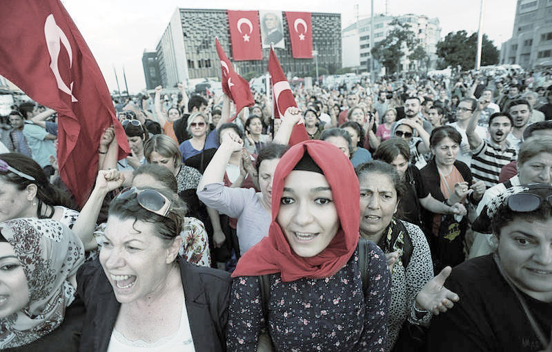 Un rato después, cuando la noche empezaba a caer, entrevisté a un grupo de gente joven que había colgado carteles condenando la censura de los medios. Los mensajes habían sido traducidos a dos docenas de lenguas. La llegada de la oscuridad incrementó la probabilidad de intervención policial, provocando que una mujer joven sacara un marcador y escribiera grupo y factor sanguíneo en su brazo. “¿Tan decidida está?”, le pregunté. “Somos un arco iris y Erdogan está tratando de pintarnos a todos de negro”, me respondió. “Somos un arco iris. No vamos a rendirnos”.